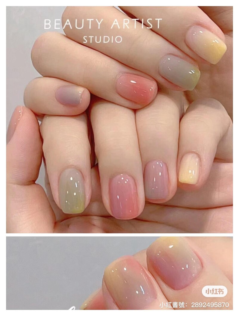 缤纷又带点通透感,是我们对糖果的第一印象。通常水果风味的糖果,颜色上也会根据口味不同变化,打造出如彩虹般缤纷,却不会过于饱和难驾驭的色彩。运用在美甲上,多为高明度的浅色系,可能是10只手指头选上不同的色彩,或是在甲面上以晕染、拼接手法呈现撞色、跳色的风格,粉红、粉蓝、黄、浅绿都是常见色系。