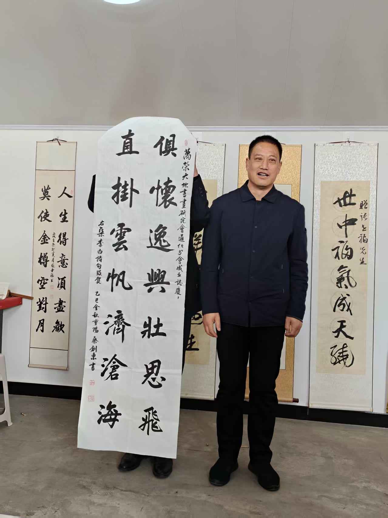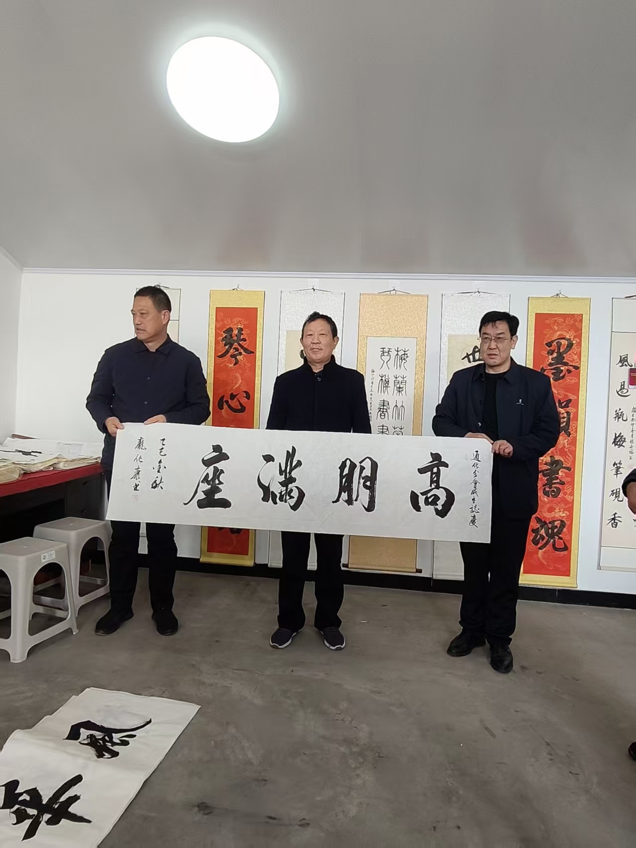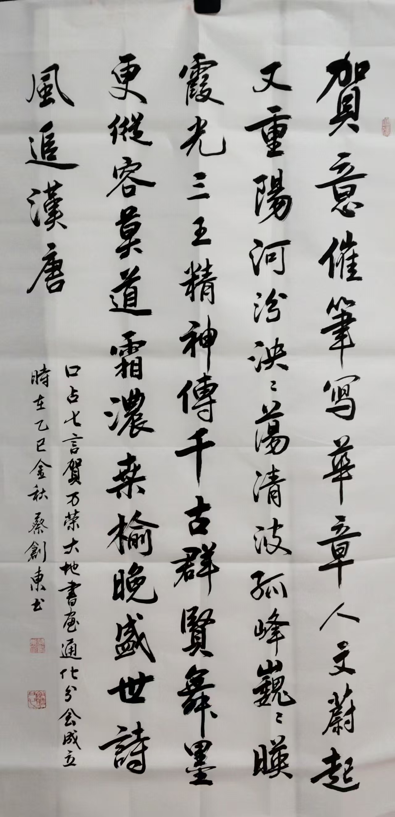 大地书画理事蔡仲东贺诗:贺意催笔写华章,人文蔚起正重阳。河汾泱泱荡清波,孤峰巍巍映霞光。三王精神千古传,群贤舞墨更从容。莫到霜浓桑榆晚,盛世诗风追汉唐。