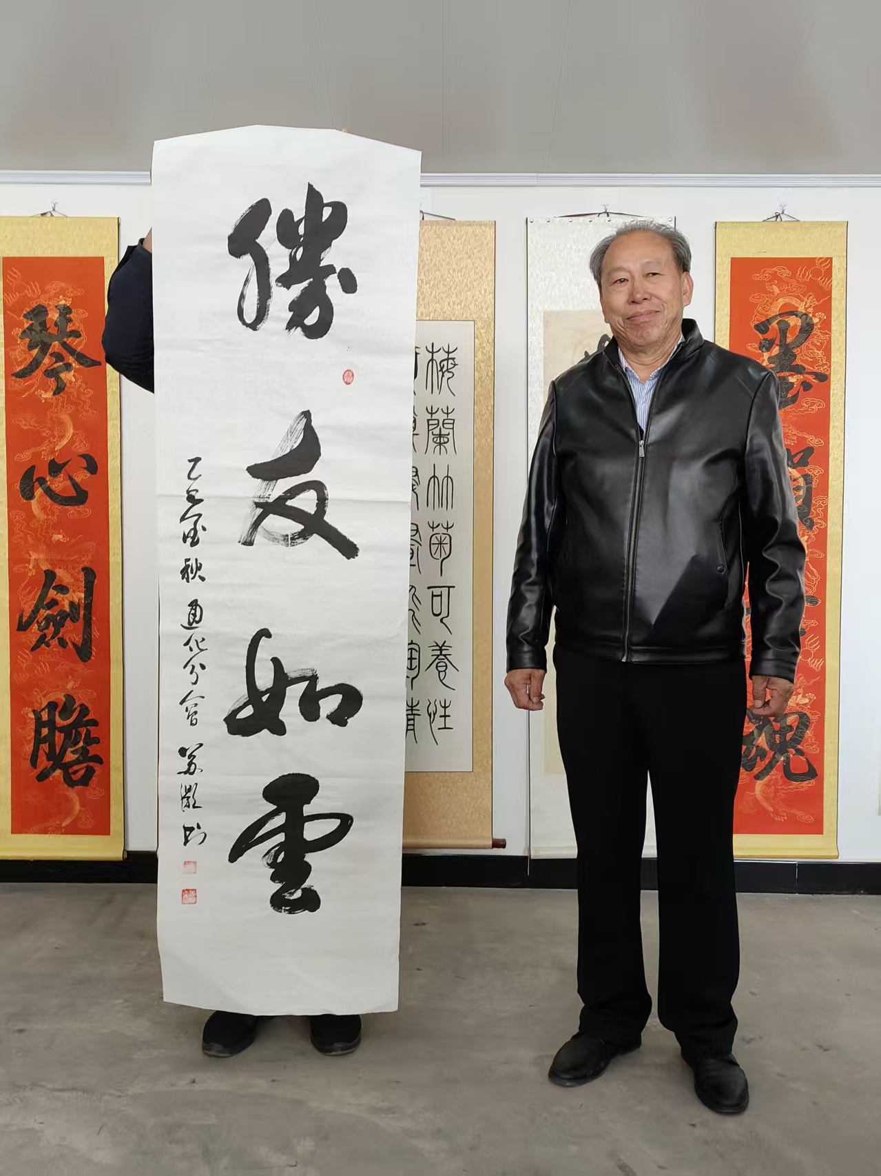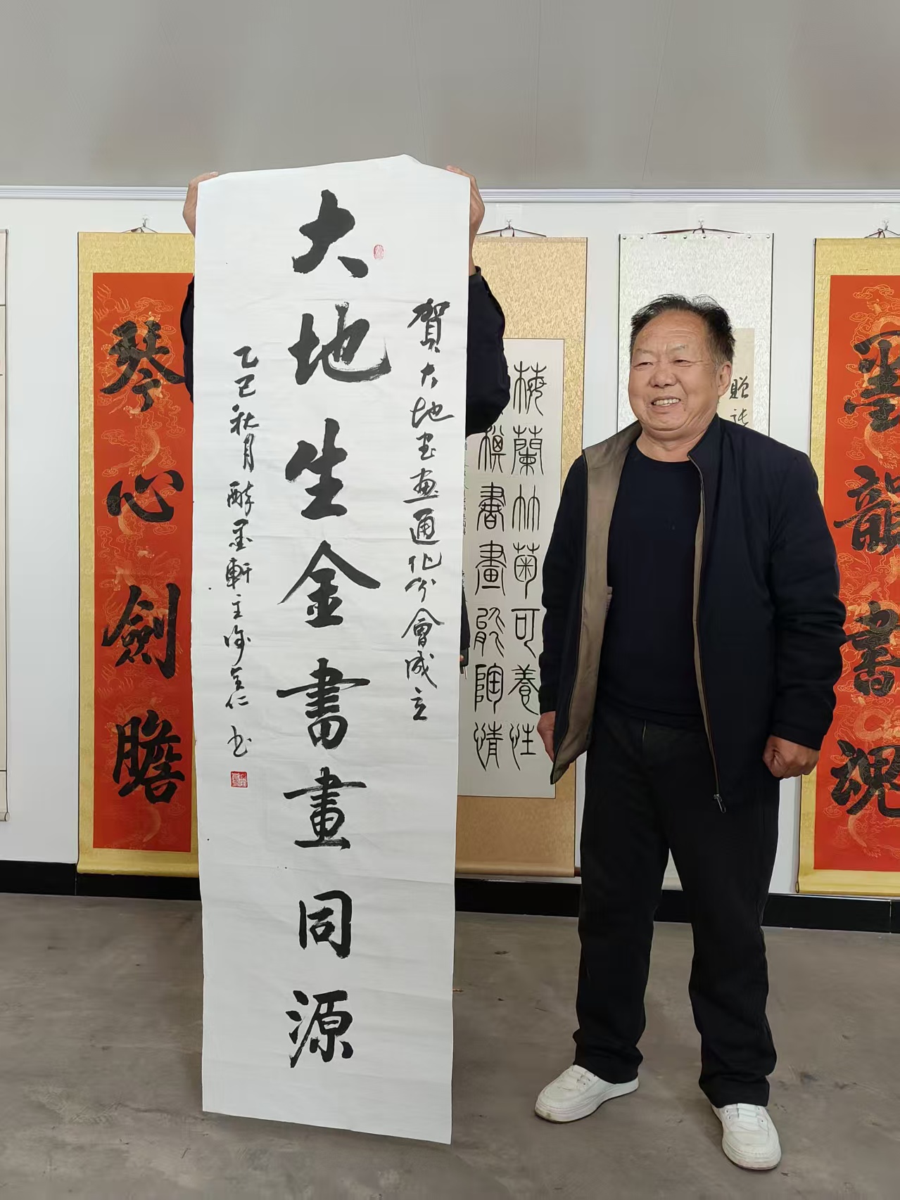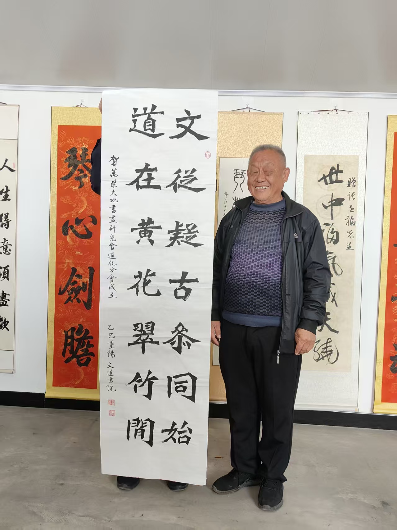 大地书画理事蔡仲东贺诗:贺意催笔写华章,人文蔚起正重阳。河汾泱泱荡清波,孤峰巍巍映霞光。三王精神千古传,群贤舞墨更从容。莫到霜浓桑榆晚,盛世诗风追汉唐。